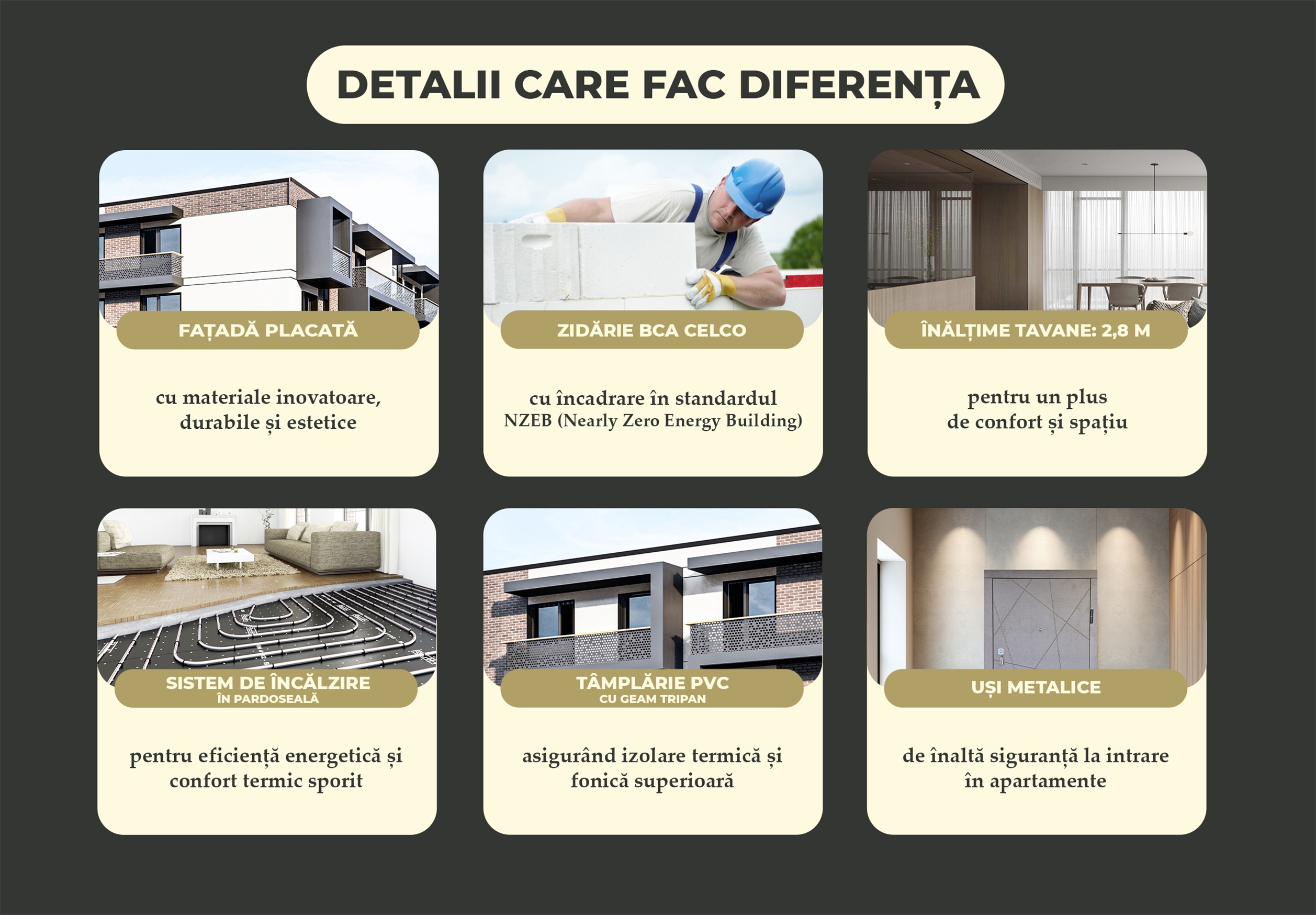 Ne dedicăm zilnic dezvoltării unui concept rezidențial exclusivist, folosind materiale premium și tehnologii moderne. Proiectul oferă multiple beneficii ce răspund nevoilor actuale ale locatarilor: eficiență energetică, finisaje de înaltă calitate, funcționalitate și un ambient plăcut, adaptat unui stil de viață urban echilibrat.